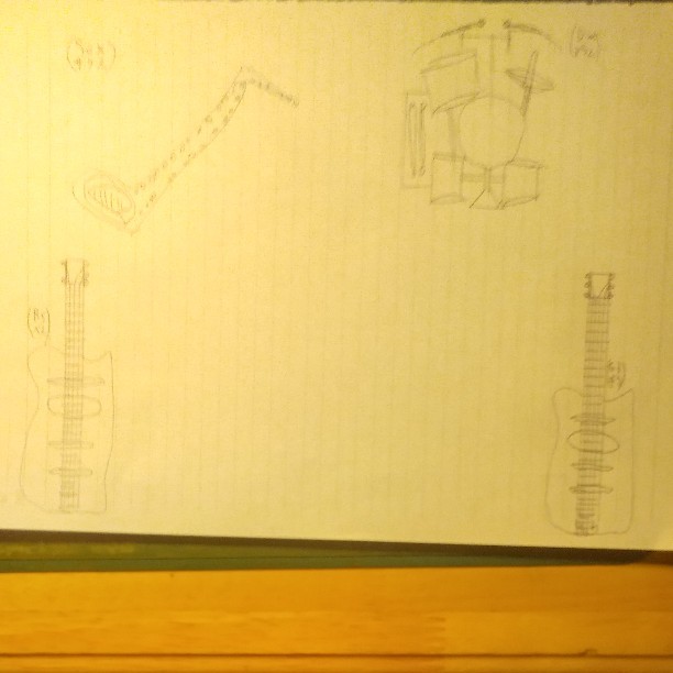 楽器のイラストです。ギター、サックス、ベース、ドラムの描画(描写)しました。適当に勘で回答のコメントをください。
