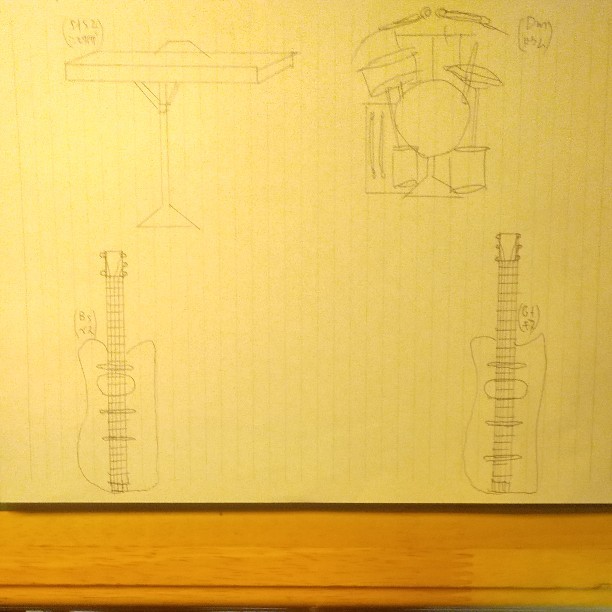 楽器のイラストです。こちらも描画(描写)しました。インスト系のバックバンドをイメージしました。ギタシンセベスドラムの回答のコメントください。
